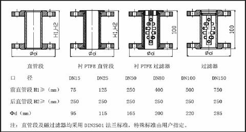 7) 安裝流量計(jì)的位置應(yīng)保證入口有≥5DN 的直管段,出口不≤250mm的直管段;如介質(zhì)中含有鐵磁***物質(zhì),應(yīng)在流量計(jì)前安裝磁***過(guò)濾器。