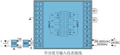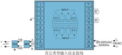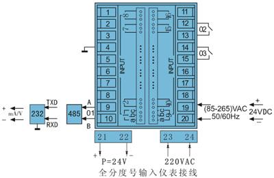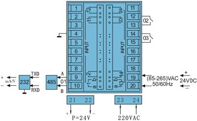 *本儀表的以下功能只能選擇其中一項:變送輸出;RS232通訊;RS485通訊;帶微型打印機通訊接口。